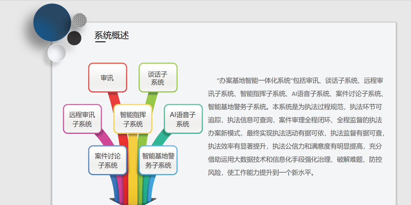 “辦案基地智能一體化系統(tǒng)”包括審訊、談話子系統(tǒng)、三遠(yuǎn)一網(wǎng)子系統(tǒng)、智能指揮子系統(tǒng)、AI語音子系統(tǒng)、案件討論子系統(tǒng)、智能基地警務(wù)子系統(tǒng)。本系統(tǒng)是為檢察院執(zhí)法過程規(guī)范,執(zhí)法環(huán)節(jié)可追蹤,執(zhí)法信息可查詢,案件審理全程閉環(huán)、全程監(jiān)督的執(zhí)法辦案新模式,最終實(shí)現(xiàn)執(zhí)法活動(dòng)有據(jù)可依,執(zhí)法監(jiān)督有據(jù)可查,執(zhí)法效率有顯著提升,執(zhí)法公信力和滿意度有明顯提高,充分借助運(yùn)用大數(shù)據(jù)技術(shù)和信息化手段強(qiáng)化治理、破解難題、防控風(fēng)險(xiǎn),使檢察院工作能力提升到一個(gè)新水平。